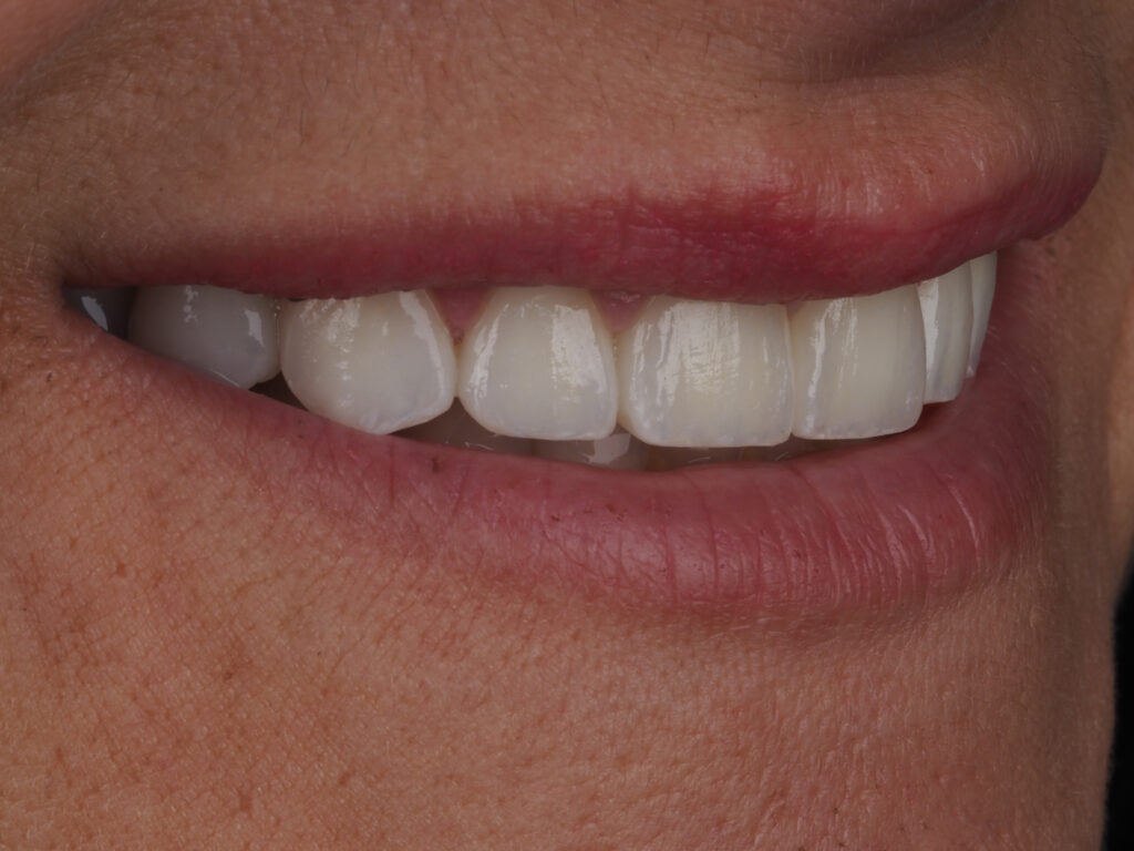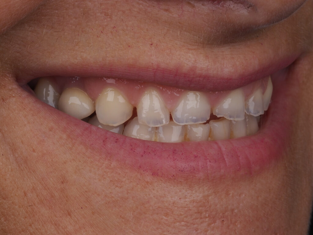 En las imágenes del antes, podemos observar que la paciente presentaba un desgaste severo en el sector anterior. Los bordes de los incisivos habían perdido su forma redondeada natural, mostrando una línea de sonrisa plana y con pequeñas fracturas.